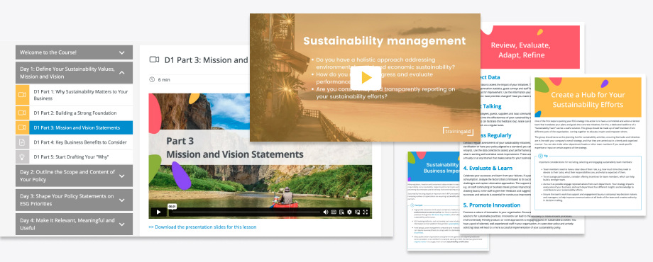 Overview Schedule Syllabus Contributors Overview Get started on concrete steps to establishing your sustainability policy and strategy If you've worked on sustainability award or certification processes, or been part of any framework following sustainability standards, you've come across requirements for a sustainability policy. Having a clearly defined sustainability policy (and importantly - having it implemented) is often one of the main, and even first, criteria for many such processes. Not sure if your business meet such requirements? Need guidance on getting started? Then this self-guided online course is for you! Explore key concepts, best practices, and practical insights that will help enhance your company's sustainability performance. Your sustainability policy will be a critical element of your overall approach to sustainability management and ESG (Environmental, Social and Governance) commitments. Get started now on building a solid understanding of the what, why and how of developing and implementing an effective sustainability policy. Learning Objectives This course will strengthen your knowledge and guide your work on: Getting started with an outline of your sustainability policy. Articulating your core values and purpose to guide your commitment. Identifying your ESG (Environmental, Social, Governance) priorities. Ensuring your policy is relevant to your business and stakeholders. Designing and implementing your policy as a useful living document. Key Outcomes Following the lessons and instructions in this course, you will take concrete steps in building: A solid foundation: Your sustainability policy will serve as a guidance document, outlining your sustainability commitments and providing a consistent framework for how you will incorporate environmental, social and ethical considerations into your organisation. An engagement and communication tool: Your sustainability policy should serve both as an internal guide and an external communication and engagement tool. As such, the development and delivery of your policy should reflect your internal and external stakeholder relations. A living policy document: The key to having a sustainability policy that works for you is actually implementing your policy, not just writing and publishing one. The words in your policy must be turned into actionable, measurable and concrete responsibilities. Schedule Dates Length Type Format Language Price Register Dates: 3 - 5 hrs Online On Demand English 35,00 € Register Course ID: TA-SPS-TO Length: 3 - 5 hrs Type:Online Format: On Demand Trainers and Contributors: Ayako Ezaki, Nia Klatte Language: English Price:35,00 € Register Enough spaces available Don't wait too long Fully booked Training already confirmed Syllabus 30 minutes per day, 5 days. Each of the five modules of this course takes half an hour to complete. With a short and focused learning session each day (for example during your break, or on your daily commute), you can finish the course just in one work week. Each module contains three sections: WATCH: Review the video lesson on key topics READ: Learn more from real-life examples DO: Apply your knowledge to your own policy Day 1: Your Sustainability Values, Mission and Vision Starting with the question why having a sustainability policy can support your business, in this module you will learn how the process of developing, implementing and using your sustainability policy will benefit your business. You will also start working on articulating your core values and purpose, which will form the basis for creating a policy that is relevant and impactful. Day 2: Outline the Scope and Content of Your Policy Building on the core values you’ve identified, in this module you will focus on what your sustainability policy actually is, and work on defining what should be covered in it and how you will apply it. Your work on outlining the scope and content of your policy will support the steps you need for creating a policy that serves as a useful tool for your business. Day 3: Shape Your Policy Statements on ESG Priorities A key approach you need for crafting an impactful policy is prioritising. In this module you will reflect on the conditions and functions within your company that will affect the implementation of your policy, and work on your policy statements - the essence of your sustainability policy - addressing key Environmental, Social and Governance focus areas. Day 4: Make It Relevant, Meaningful and Useful For your policy to be effective in inspiring commitment and action, it needs to connect with its intended audiences in a meaningful and relevant way. In this module, you will work on finding the right tone of voice for your policy, and preparing for how you will turn your policy into a useful stakeholder engagement and communication tool. Day 5: Assign Actionable, Measurable and Concrete Responsibilities To make sure your sustainability policy is a living document, you need to turn the words in your policy into actionable, measurable and concrete responsibilities. In this module, you will work on identifying and defining key approaches to developing the next steps on your journey to becoming a more responsible business, with action plans and targets. TrainingAid Learning Platform Our learning platform is designed to optimise learner experience, with the specific needs and contexts of tourism industry professionals in mind. Through our global network of partners and collaborators, TrainingAid has been offering practical and accessible opportunities for tourism professionals, helping build skills for sustainable solutions. We apply our technical expertise and practical experiences to design and develop the best learning experience our learners. To learn more about our approach to training, read our learner guide. Questions? We Are Here To Help Email Ferdinand Weps with your questions or to schedule a call. Facilitators and Contributors Nia Klatte Responsible Tourism Cons